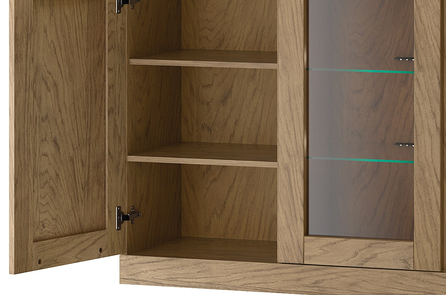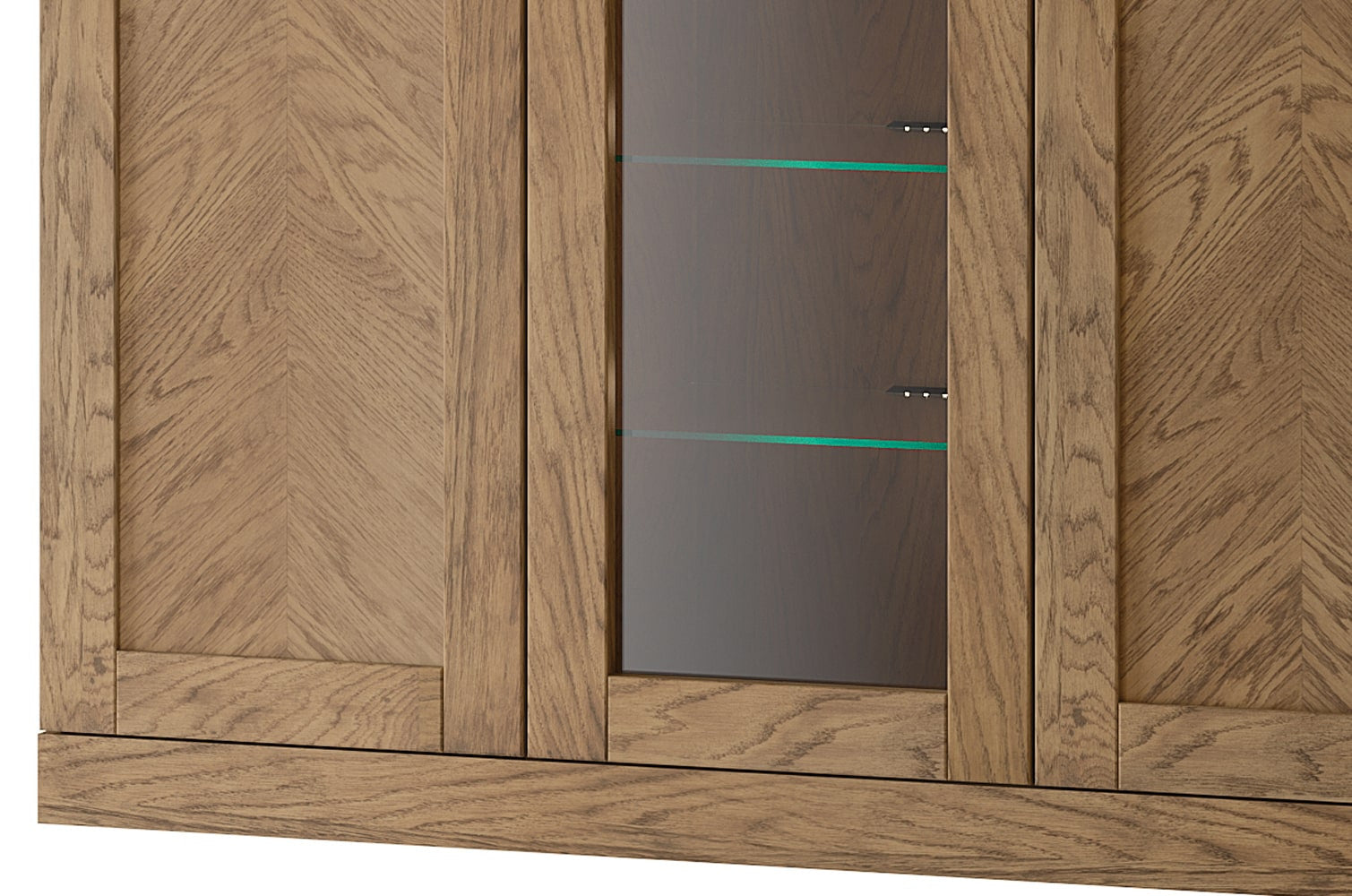 Realizzato dal fronte: Legno massiccio di quercia; elementi del pannello impiallacciati in quercia naturale con motivo a spina di pesce; vetro temperato fumé.