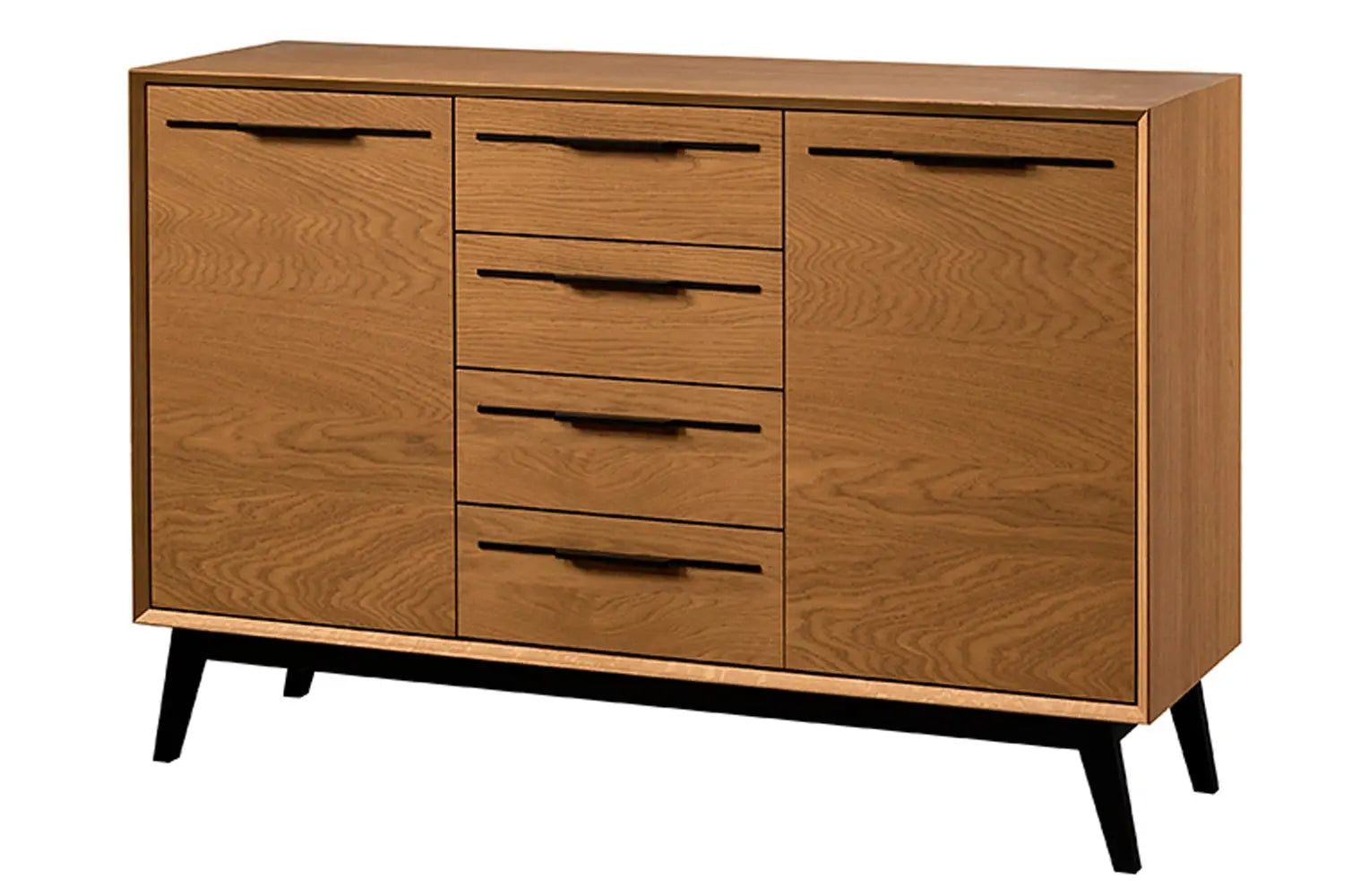 Con due ante laterali e quattro spaziosi cassetti, offre un contenimento versatile ideale per il soggiorno, la camera da letto o il corridoio. La struttura robusta, le maniglie in metallo nero e le gambe in legno massiccio ne sottolineano il carattere solido e raffinato.
