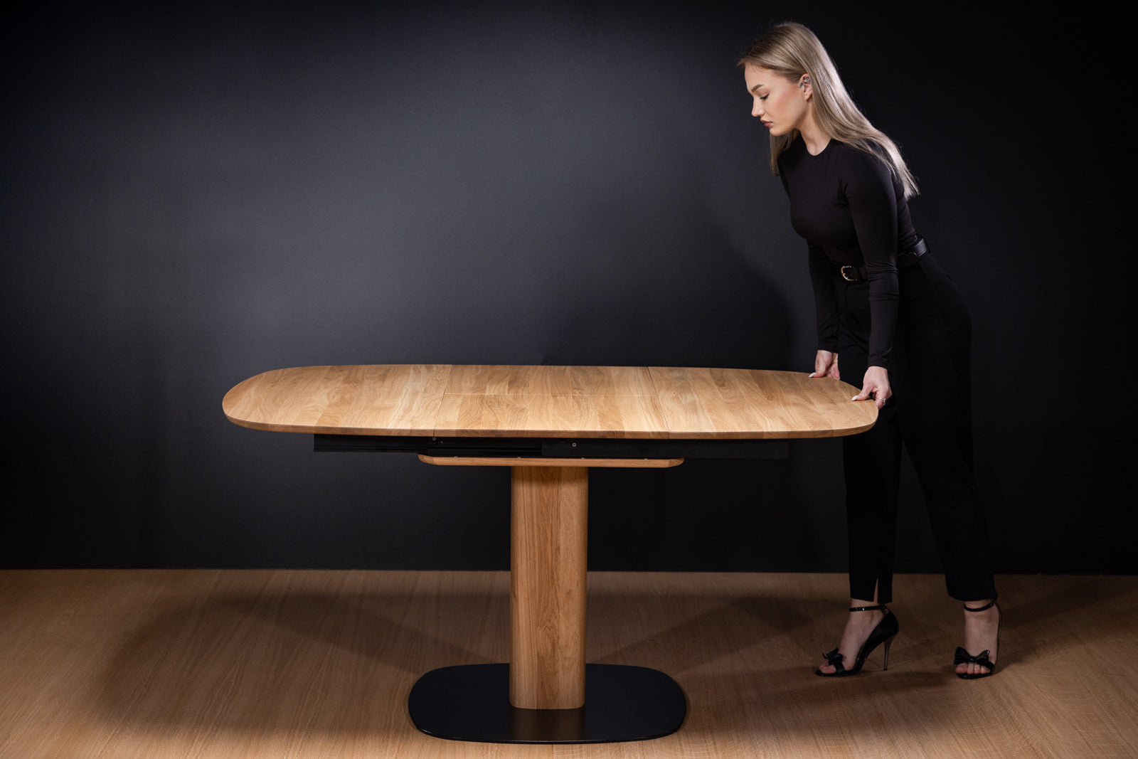 Il tavolo tavolo Luna allungabile è la perfetta combinazione di design contemporaneo e funzionalità. Il suo piano super-ellittico in legno massiccio è unito a una base centrale in acciaio nero, creando un pezzo elegante e visivamente leggero. È dotato di un meccanismo di allungamento nascosto che permette di di passare da 100 a 150 cm in pochi secondi, con un'anta integrata nel piano stesso per una finitura pulita e sofisticata.