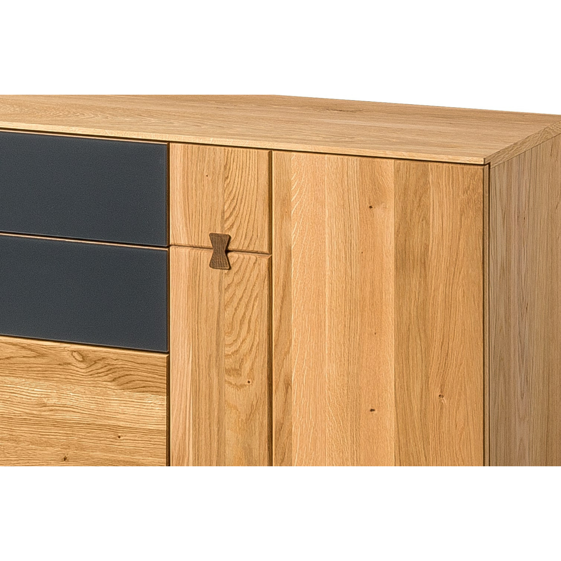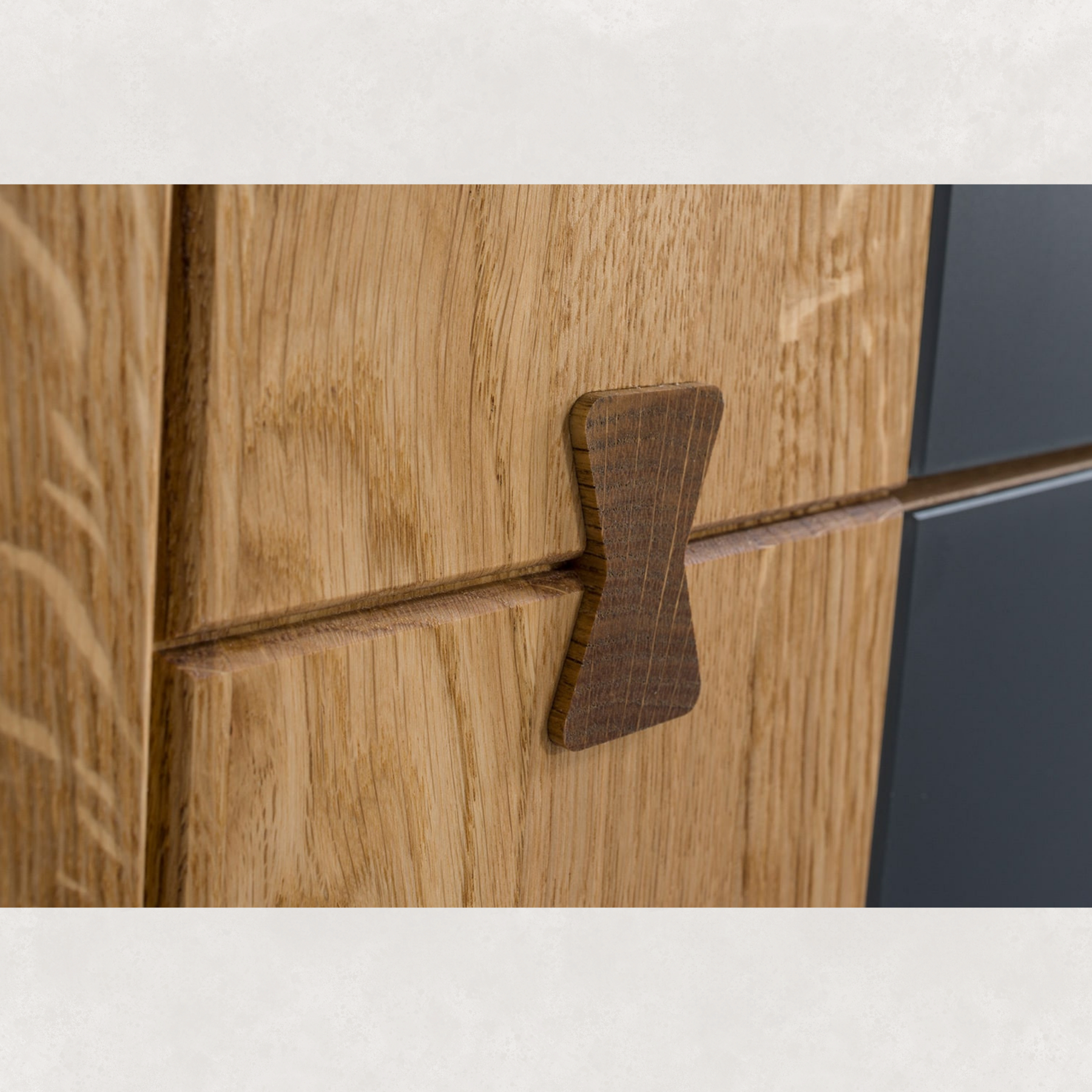 Il suo design equilibrato e orizzontale integra tre ante e tre cassetti, offrendo un'ampia capacità di contenimento per mantenere lo spazio ordinato, dall'elettronica agli utensili da cucina ai tessuti. Il contrasto tra il legno naturale e i dettagli in grafite aggiunge un tocco contemporaneo, mentre la base color antracite crea un senso di leggerezza.