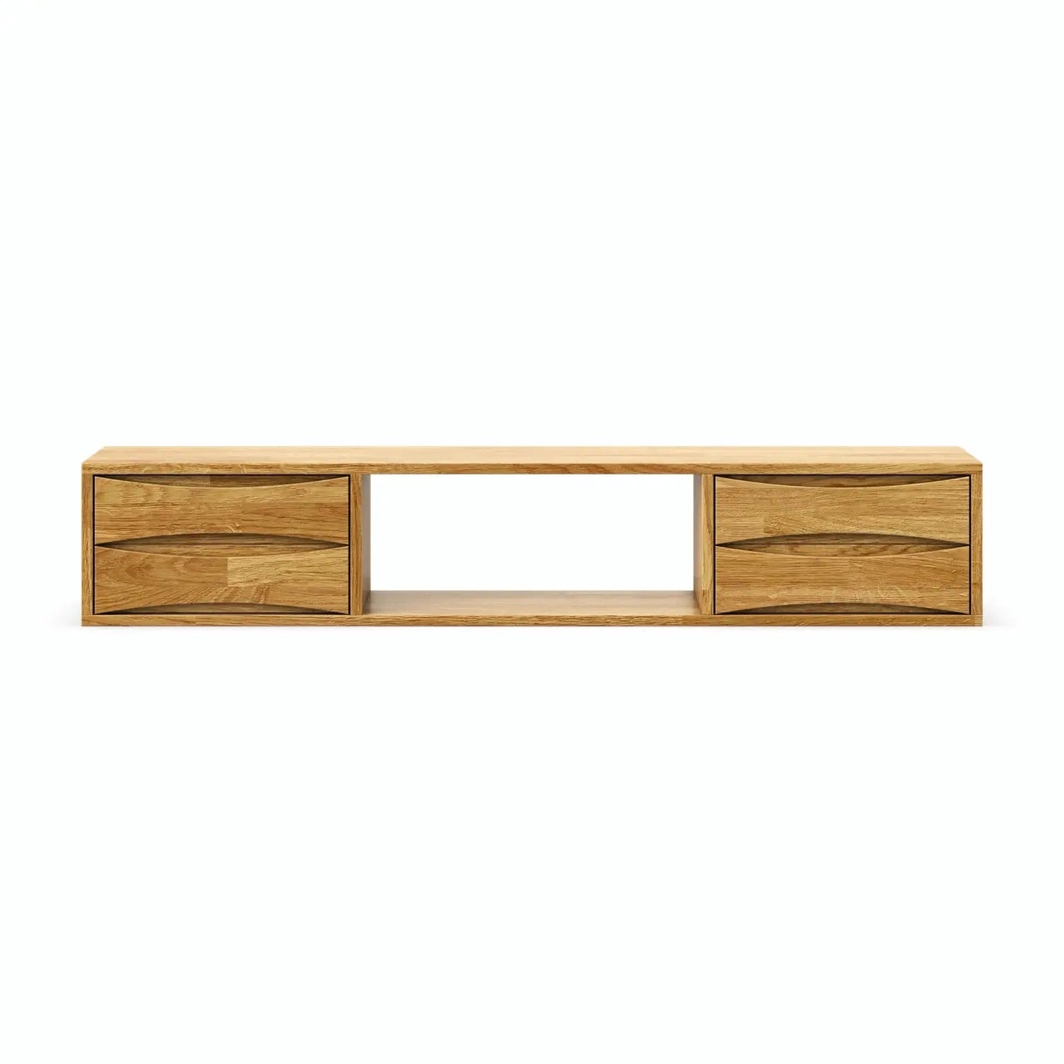 Il porta TV galleggiante Malmo in rovere massiccio è la soluzione ideale per gli spazi ridotti. Il suo design sospeso libera spazio sul pavimento, conferendo un'atmosfera leggera e moderna al soggiorno. Grazie agli ampi vani portaoggetti, è perfetto per organizzare i dispositivi elettronici e gli accessori, mantenendo un aspetto pulito e ordinato.