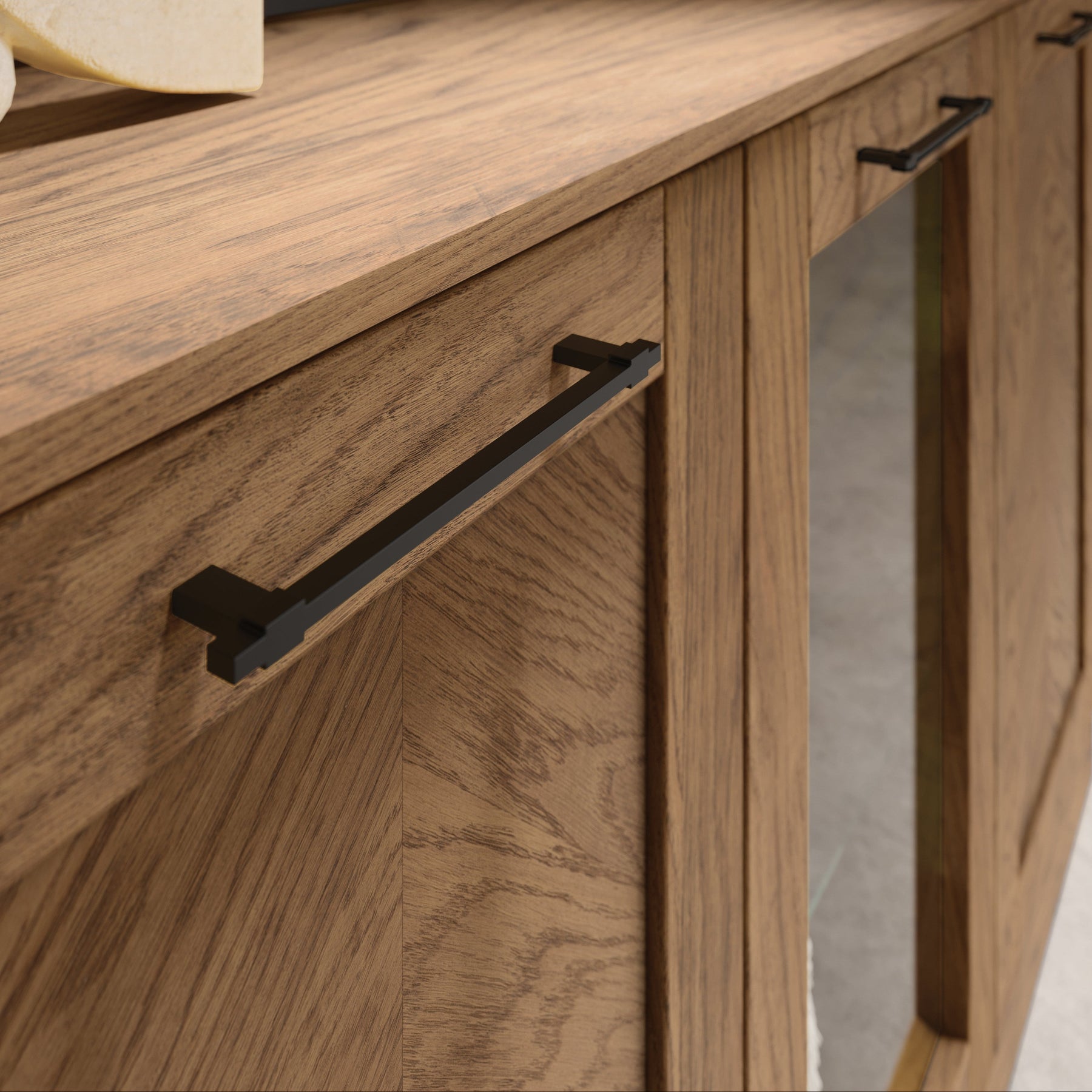 La vetrina COZY 10 combina la bellezza naturale del rovere rustico con un design contemporaneo pieno di calore. Il frontale in legno massiccio con un elegante motivo a spina di pesce esalta il carattere artigianale del pezzo, mentre i sottili dettagli in nero opaco aggiungono un tocco moderno ed equilibrato.